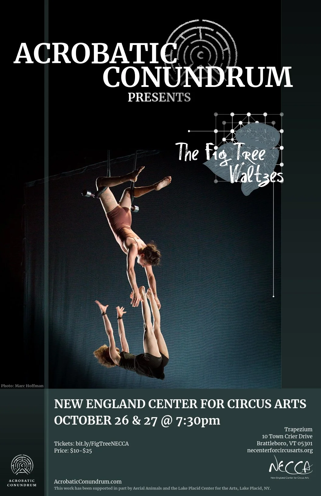 But, in Acrobatic Conundrum’s The Fig Tree Waltzes, you can choose it all. It's a world where opposite outcomes coexist, a world of infinite possibility and opportunities to play. Strong women hang from lofty trapezes and bearded men spin in hoops wearing skirts. A group of acrobats dance, tumble, and tell stories in the language of circus. In shadows cast by stage light, mirrored realities show us the paths not taken.